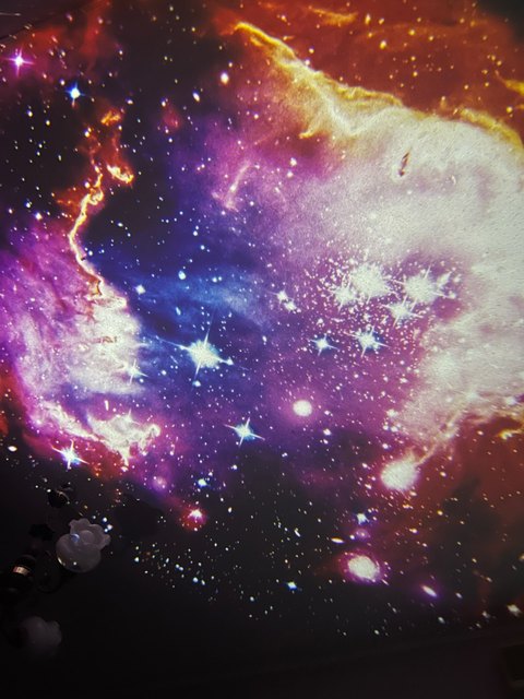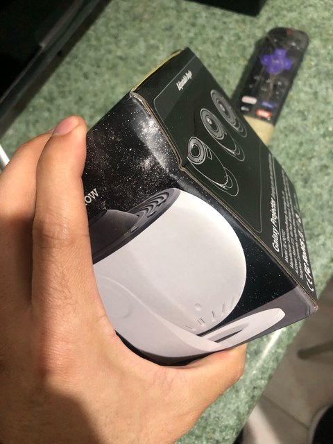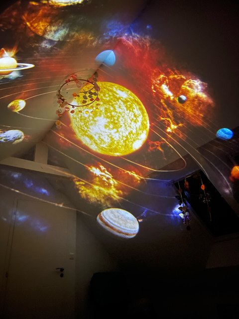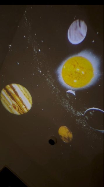Me sorprendió. Se ve muy bien el proyector, encima tiene regulador de enfoque, y solo con el proyector ya tienes luz. la lampara tiene tres grados va muy bien, también tiene el temporizador si tuviera ya musica seria lo mejor de lo mejor. La foro es de la luz que hace al minimo, no le molesta para nada al bebe