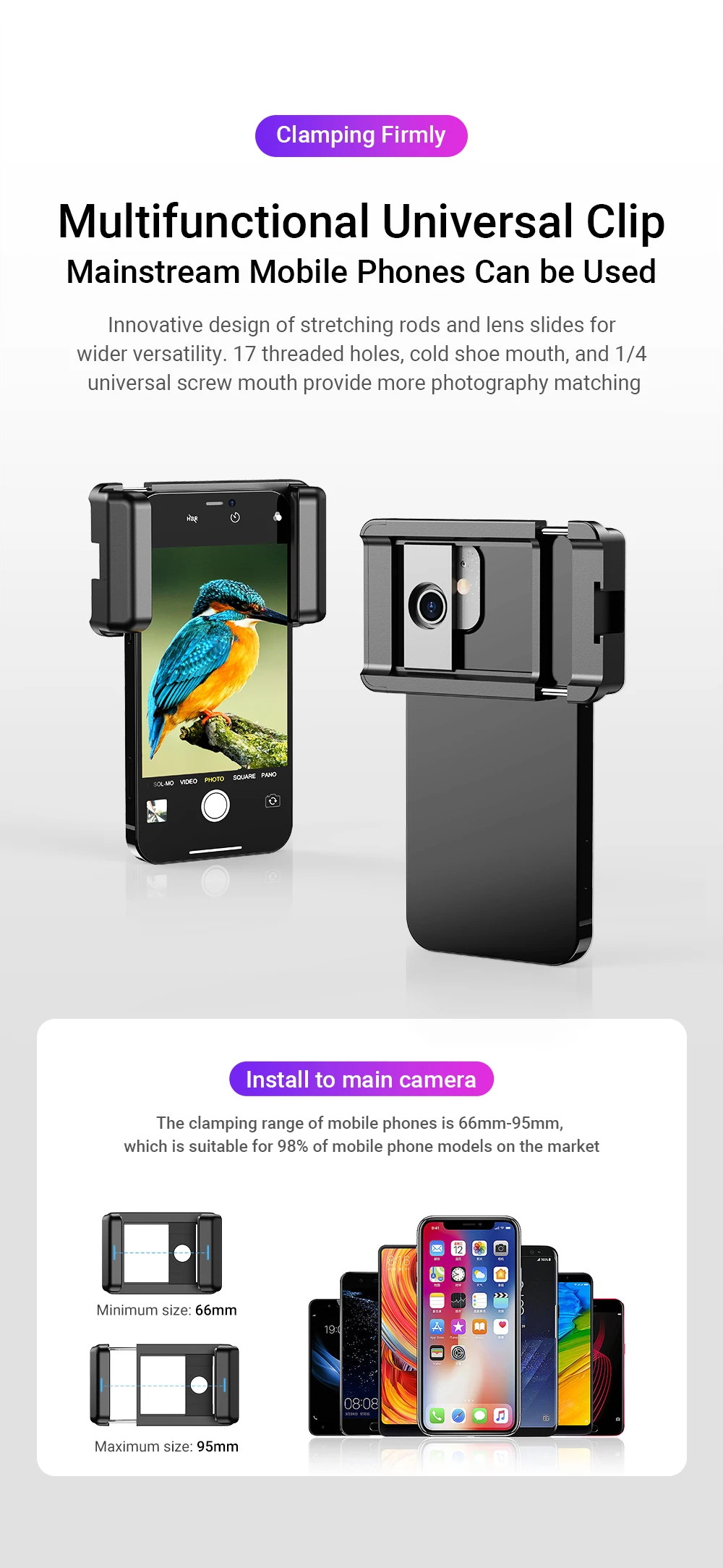 Compatible: The universal phone clip can be compatible with the vast majority of smartphones, such as Huawei, iPhone, Samsung, Xiaomi, Redmi, OPPO,MOTOROLA, Google, etc