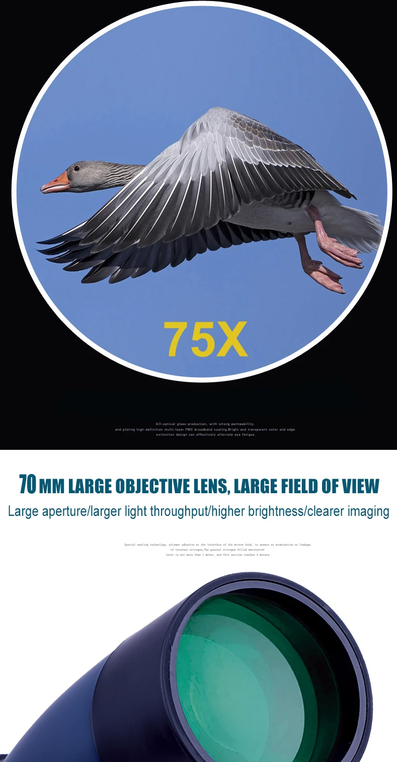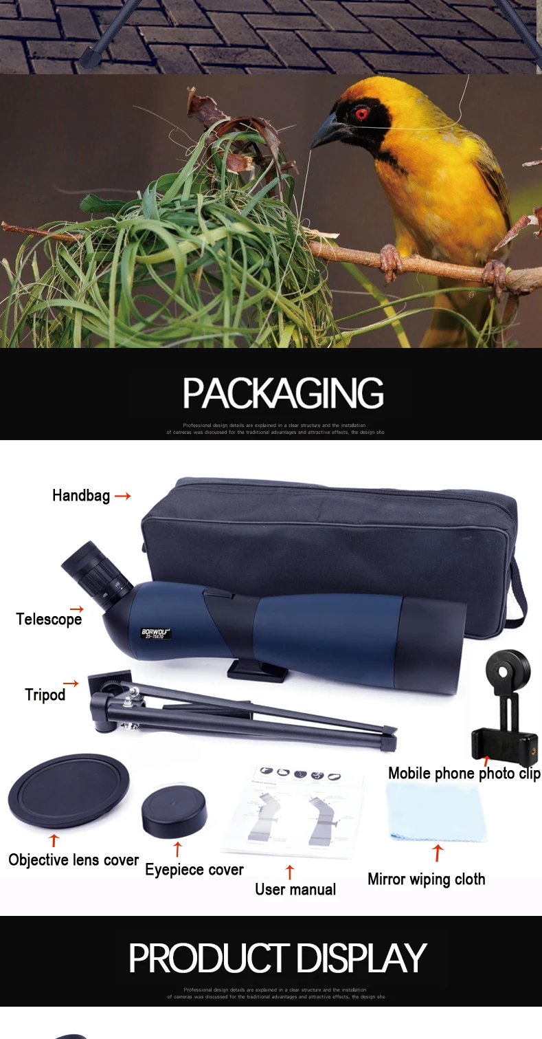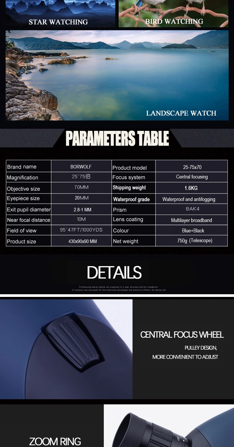 Borwolf 25-75X70 Professional Zoom Telescope Spotting Scope High Magnification HD Binoculars Monocular For Bird Watching