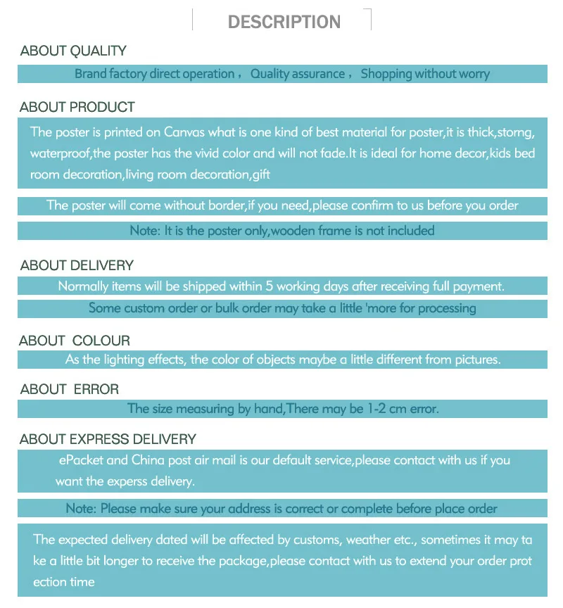 5. we accept custom sizes and pictures, if you want, pls contact with us.