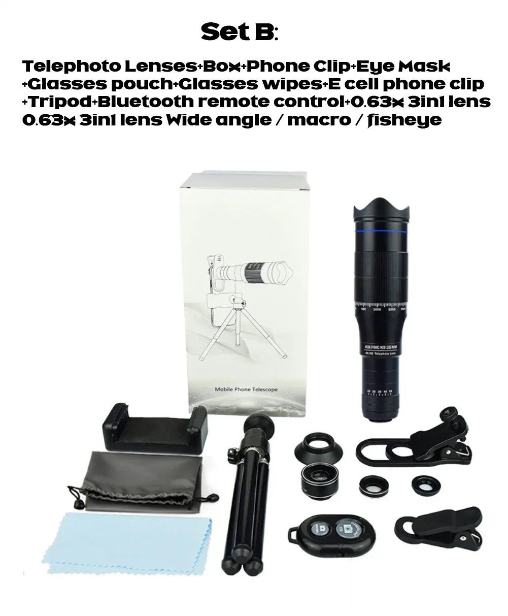 Telephoto Lenses+Box+Phone Clip+Eye Mask+Glasses pouch+Glasses wipes+E cell phone clip+Tripod+Bluetooth remote control