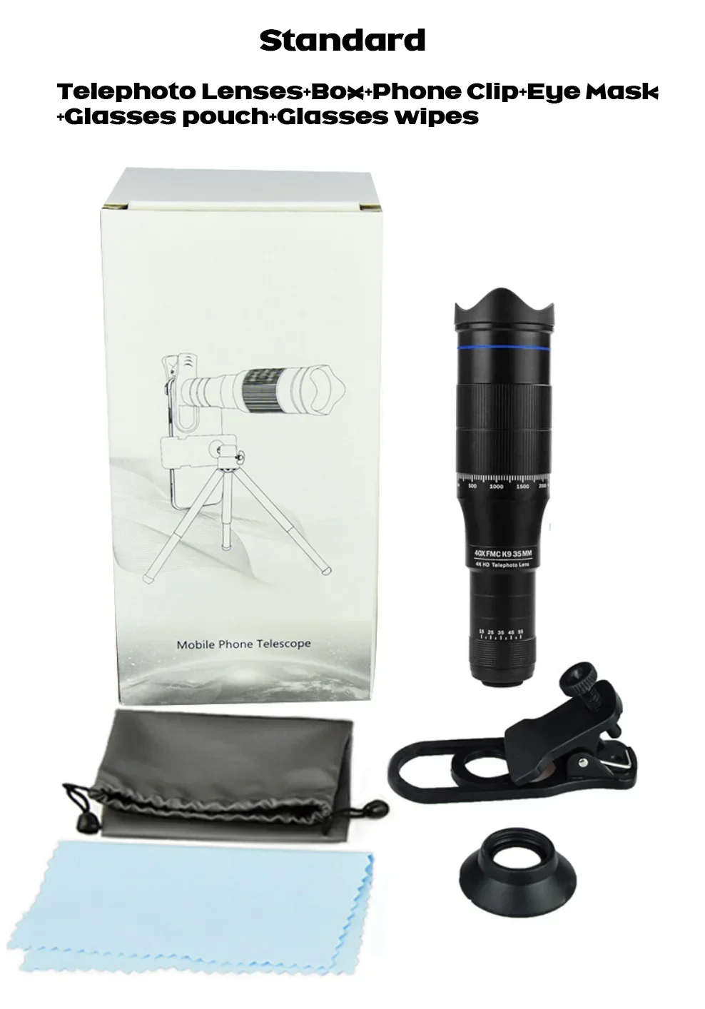 Telephoto Lenses+Box+Phone Clip+Eye Mask+Glasses pouch+Glasses wipes