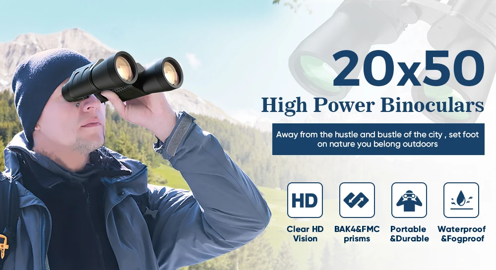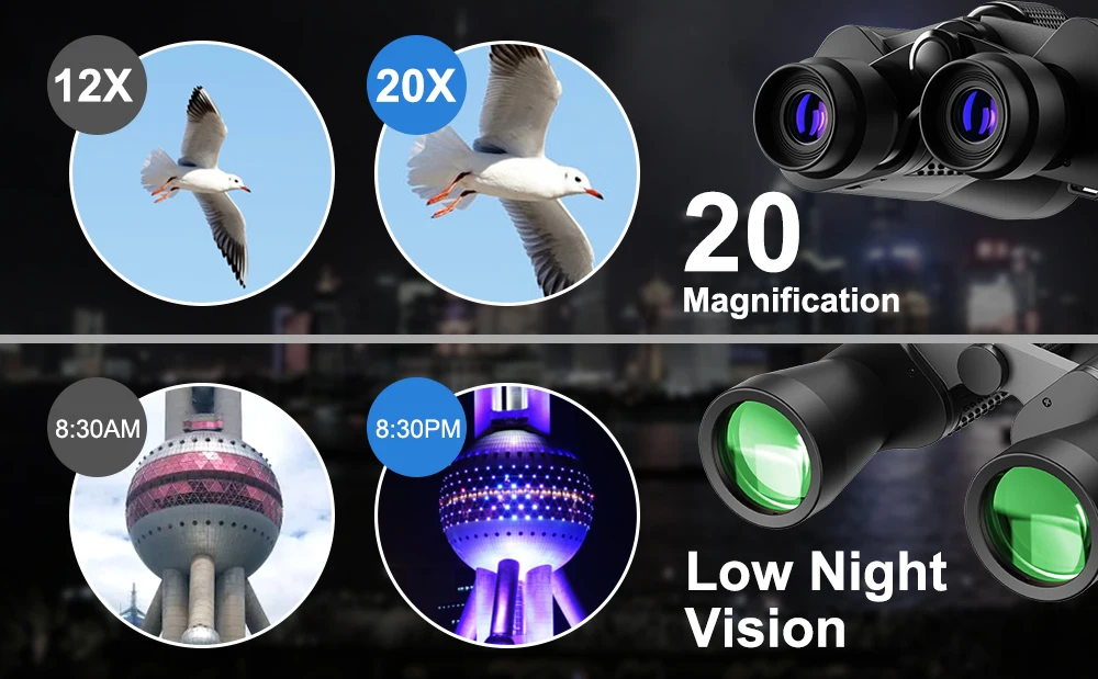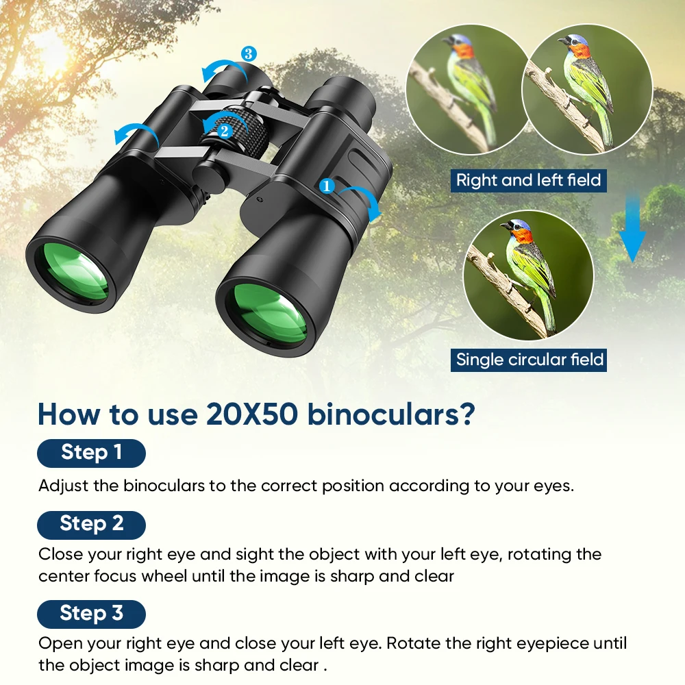* 20X50 Wide Angle Binoculars: With objective lens diameter up to 50mm with magnification 10X, this large eyepiece offers you clear image and broader viewing field.