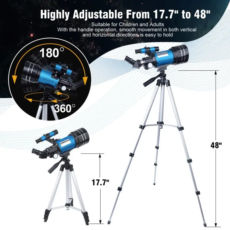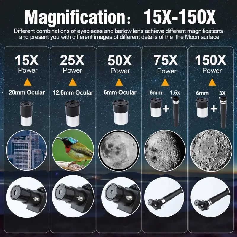 Optimum Magnification: Our telescope for kids and adults is quipped with three replaceable excellent-quality eyepieces (20mm,12mm,6mm) with 3x Barlow lens ,magnificate moon up to 15 or 150 times. Also with 5×24 finder scope makes locating objects easy.