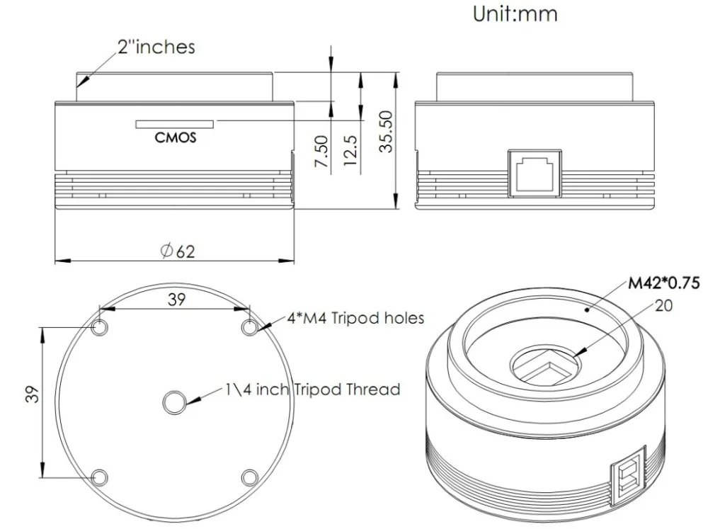 USB 3.0 Port:can provide 5Gb bandwidth to let ASI224 run at 64fps (12bit, normal mode) or 150 fps (10bit, high speed mode) at full resolution(1.2Mega).